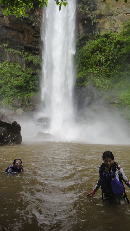 滝つぼで泳ぎ始めたら太陽も顔を出してくれました♪